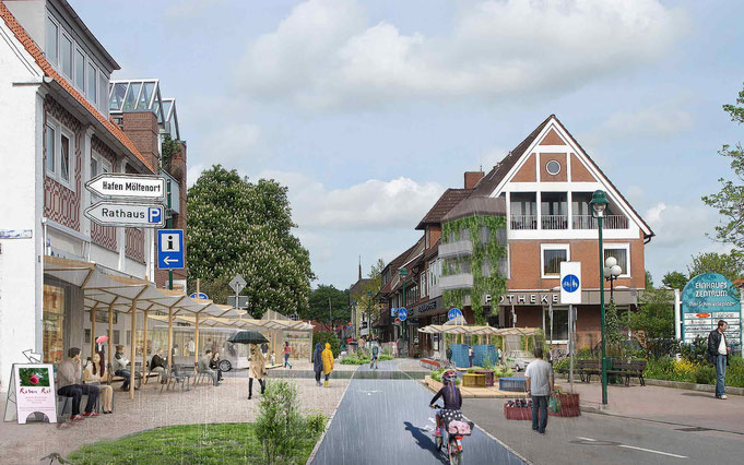 Blick in die Dorfstraße - ohne Autoverkehr. Eine Vision 2040. (Foto,Bearbeitung,Zeichnung uDa)