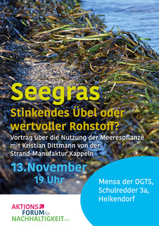 Seegras – für viele nur ein lästiges Strandgut, für andere ein faszinierender Rohstoff mit großem Potenzial. In seinem Vortrag am 13.November zeigt Kristian Dittmann unter anderem wie er das vermeintliche Abfallprodukt in seiner Strand-Manufaktur zu hochwertigen Kissen verarbeitet. Dabei erfährt das Publikum, welche erstaunlichen Eigenschaften in Seegras stecken, warum es für Natur und Mensch gleichermaßen wertvoll ist und wie nachhaltige Nutzung neue Wege eröffnen kann. Ein inspirierender Einblick in ein Naturmaterial, das mehr kann, als man auf den ersten Blick vermutet.